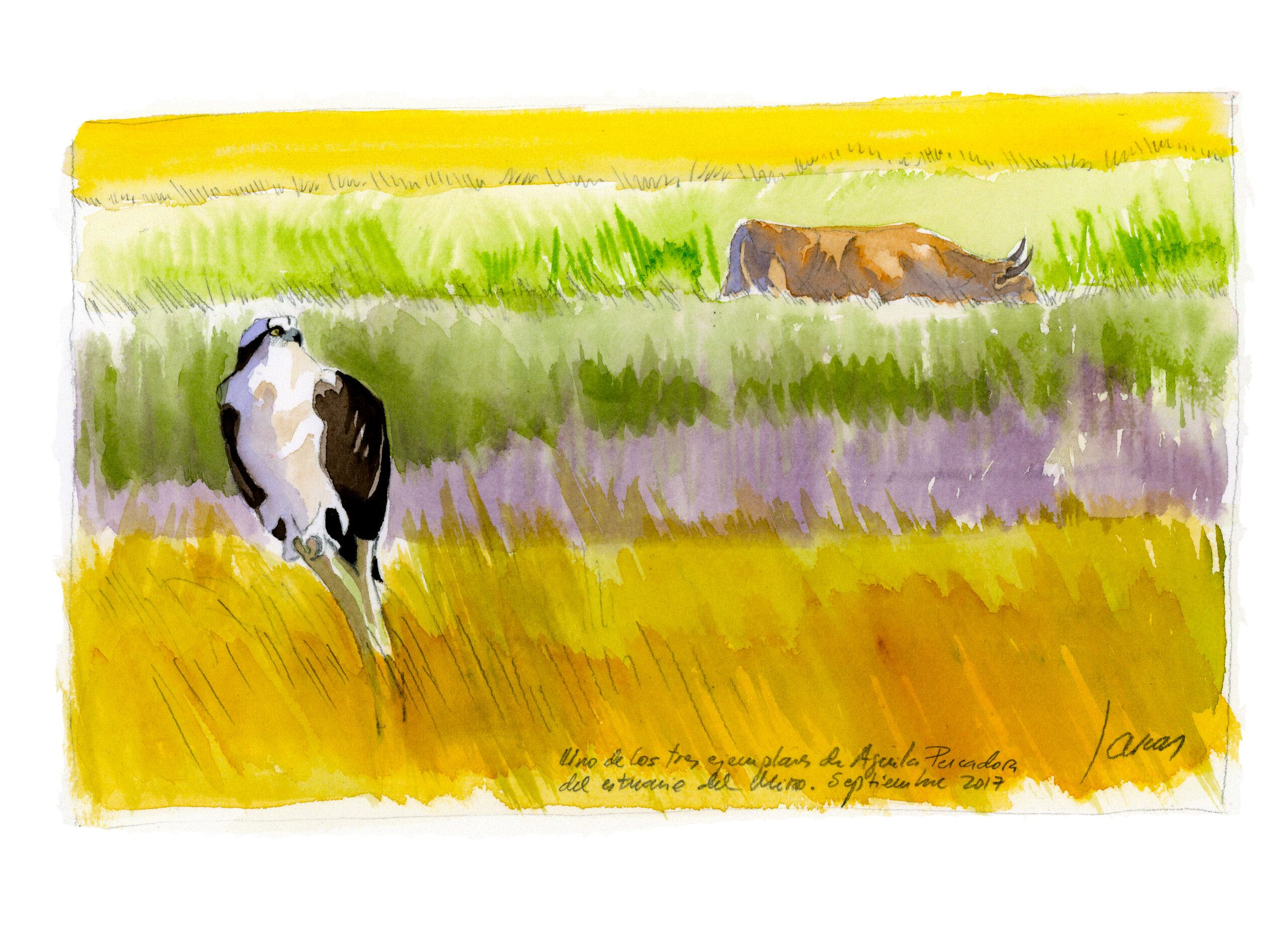 El Águila pescadora, Pandion haliaetus, es un a especie presente todo el año en el Estuario del Miño y cuando se deje ver, permanece largo tiempo en uno de sus posaderos habituales, como el de esta acuarela, situado en la Illa da Xunqueira.