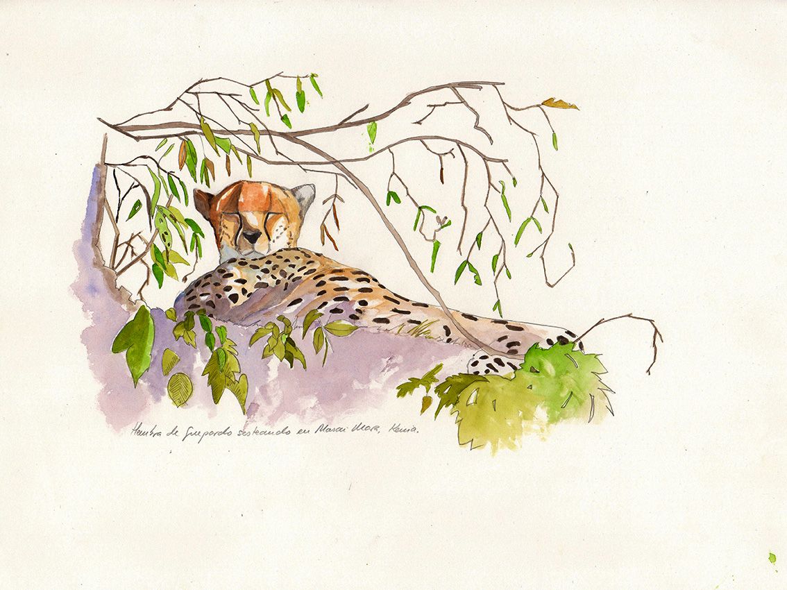 La primera vez que vi un guepardo delante de mi, a pocos metros, me llamaron la atención dos cosas; su tamaño, más grande de lo que me imaginaba y en segundo lugar lo habituados que están a la presencia de coches de safaris, lo que me entristece un poco. Este guepardo, una hembra adulta, permaneció tumbada largo tiempo y estuvimos observándola cerca de dies minutos, hacerlo más tiempo, a parte de que es molesto para los animales, está prohibido por la guardertía del parque y pueden sancionar al conductor con quitarle la licencia de guía. Justo en el último instante, cuando nos disponíamos a abandonarla, asomó la cabeza un diminuto cachorro. En Kenia, cada minuto surge una sorpresa.