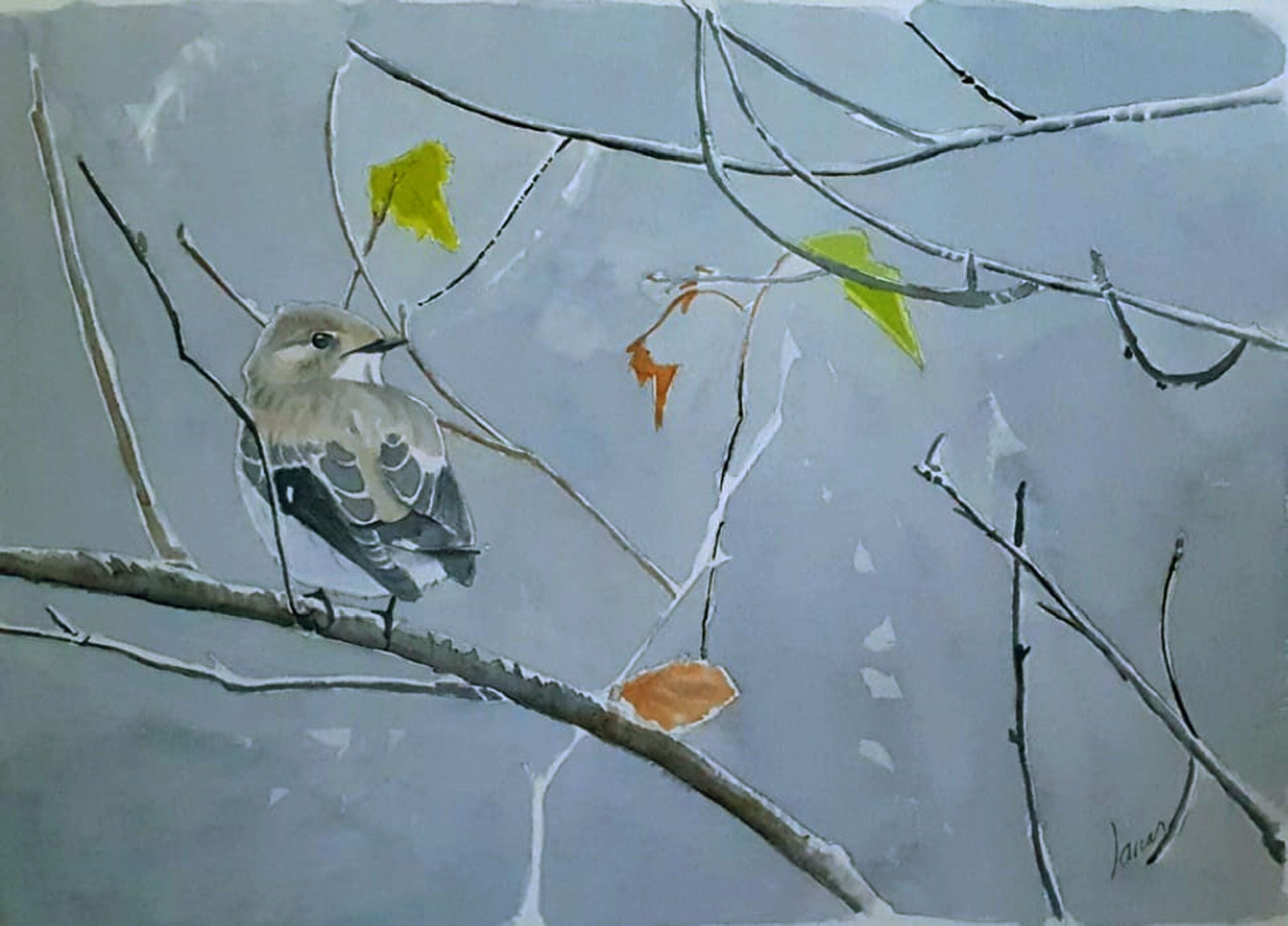 De las decenas de especies de paseriformes que cruzan la península durante la migración otoñal o posnupcial, mis preferidos son los papamoscas. Dos especies son las más comunes; el Papamoscas cerrojillo (Ficedula hypoleuca) y el Papamoscas gris (Muscicapa striata). En esta acuarela he pintado un adulto de papamoscas cerrojillo, ¿porqué es adulto? fijaros en las terciarias, tienen el borde blanco ininterrumpido alrededor de la pluma, los juveniles, en cambio, estas plumas presentan como una especie de muesca.