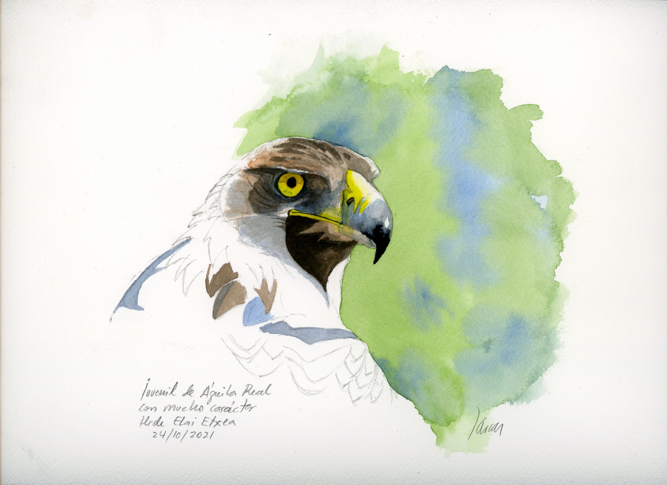 Esta acuarela ilustró uno de los reportajes de la trilogía dedicada a Euskadi en el apartado de «Pintando en…» de la revista El Ecoturista. Se trata de un juvenil de Águila real que acudió con  sus progenitores al comedero del hide de Elai Etxea, en Vitoria.