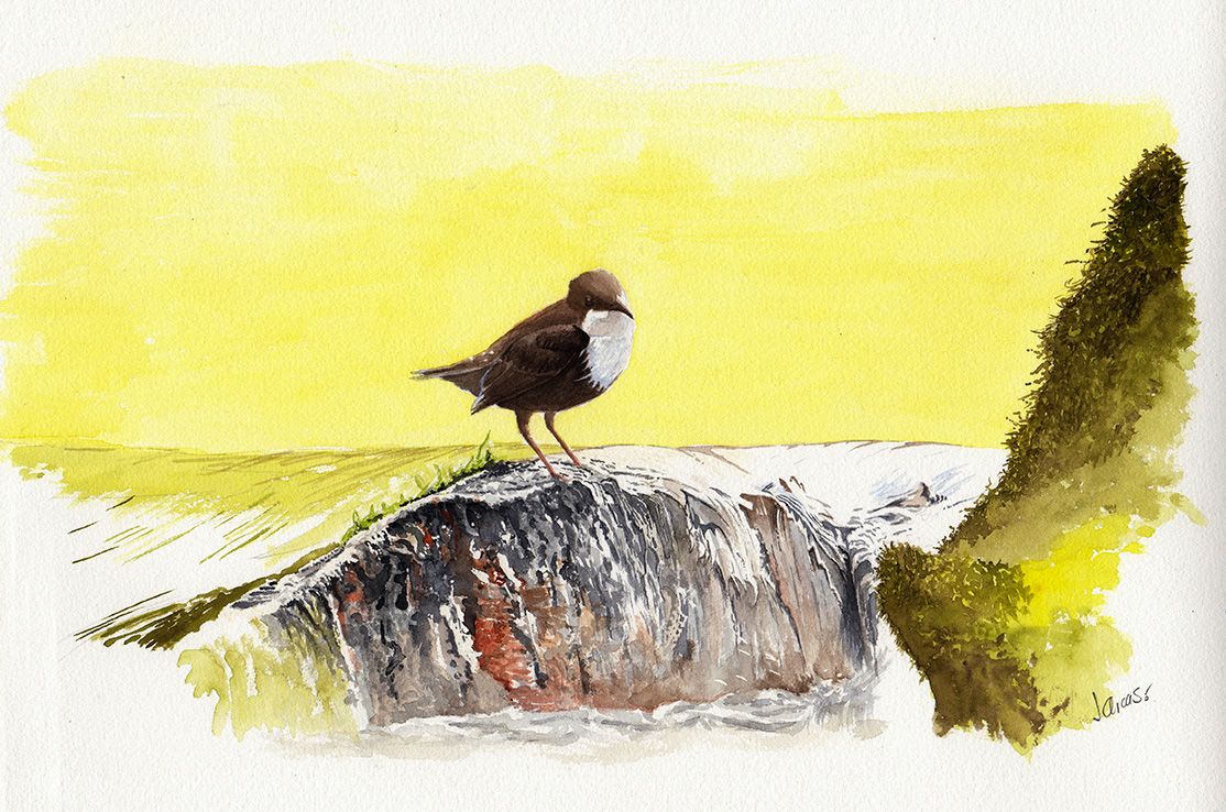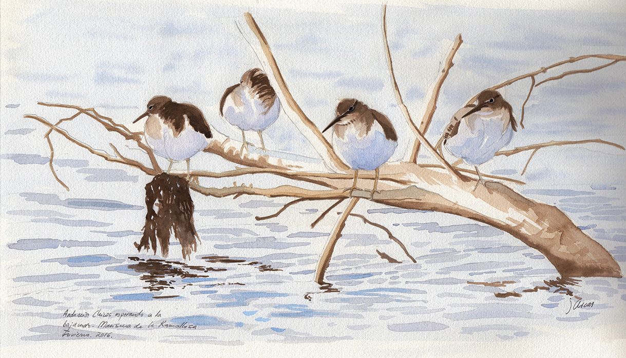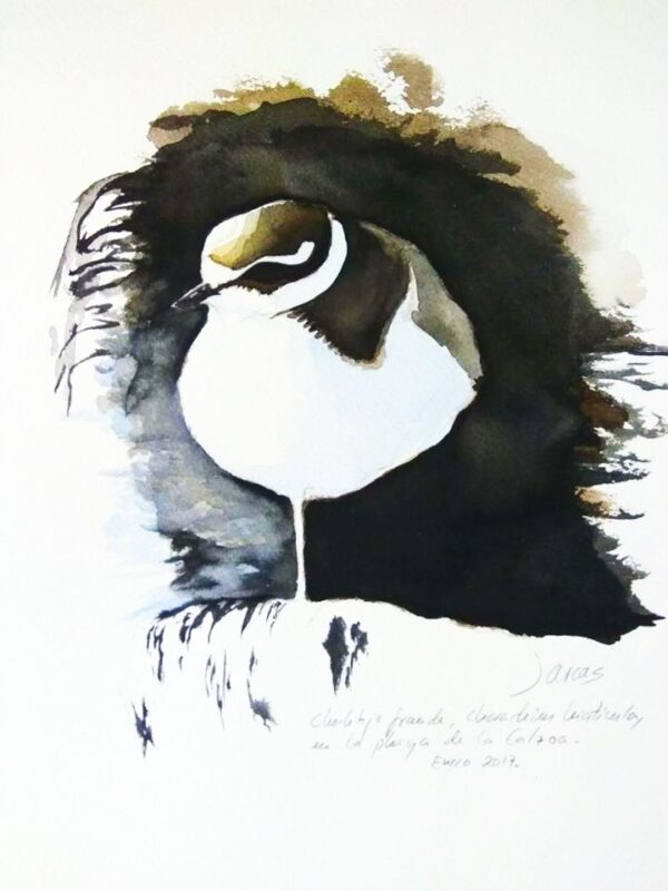 Precioso contraluz de una de mis limícolas preferidas, el Chorlitejo grande, Charadrius hiaticula. Acuarela s...